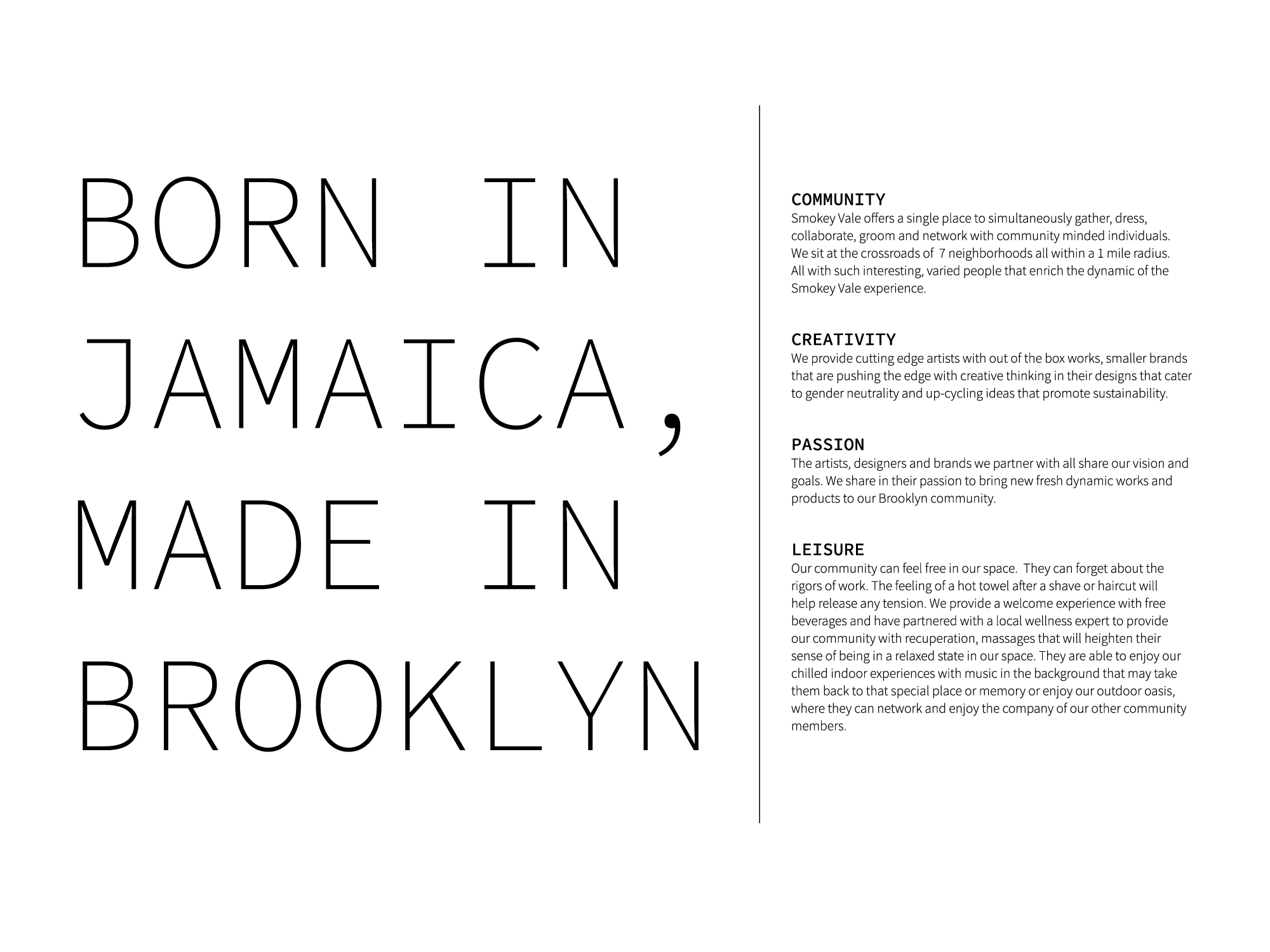 Smokey Vale was a concept shop in Brooklyn from 2020-2024. They offered barber services in a comfortable setting with along with upscale clothing and accessories. We joined the team in 2022 to help them launch a subtle rebrand, as well as elevate the creative direction across campaigns, the in-store experience, the seasonal product buy, and be more gender inclusive. We kept a version of the original logotype designed by a friend of the shop, and built out the brand guidelines to support a full brand design system. The result was a cohesive and evocative visual identity that we applied to social media campaigns, retail packaging, and e-commerce design. We took the identity system a step further by creating four customer archetypes. These customer profiles helped refine the retail buying approach and support general brand strategy.